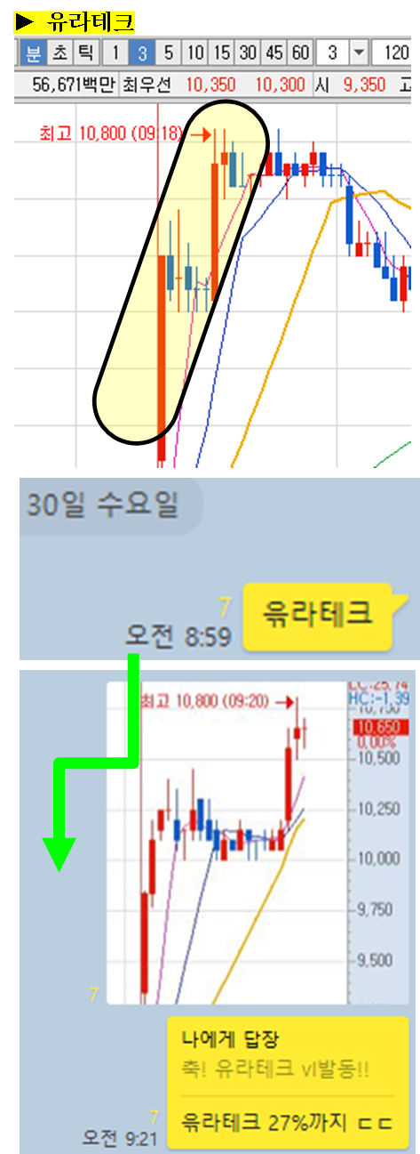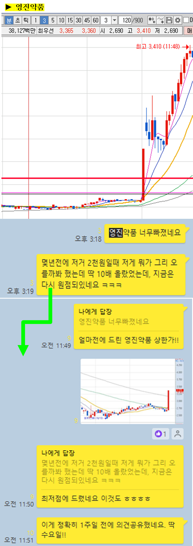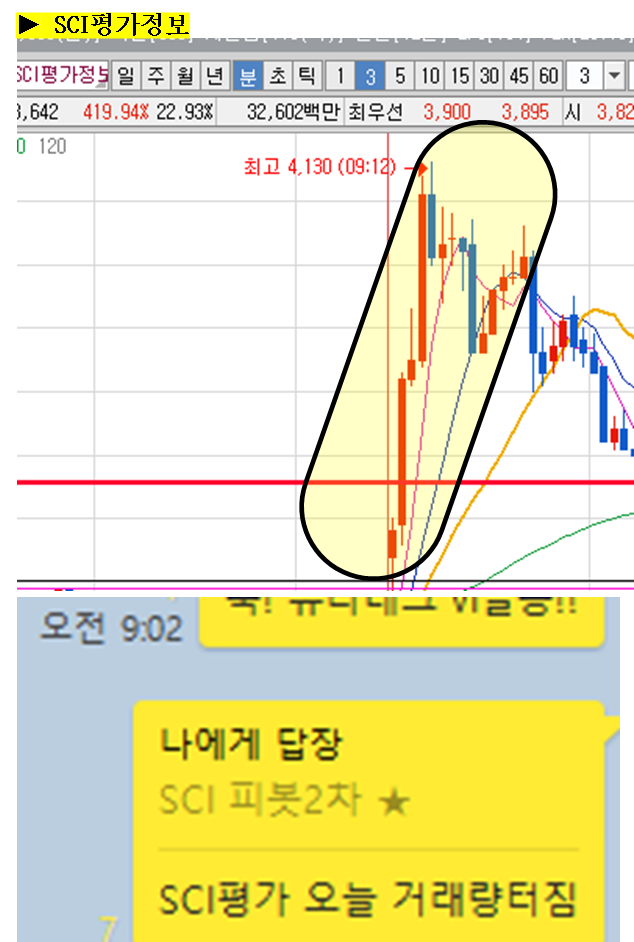 주식종목을 공유한 이후 주식의 움직임에 대해 그 현장을 생생하게 박제하여 생동감 있게 보여드리겠습니다. (차트에서 노란색 음영으로 표시된 부분을 자세히 봐주세요)