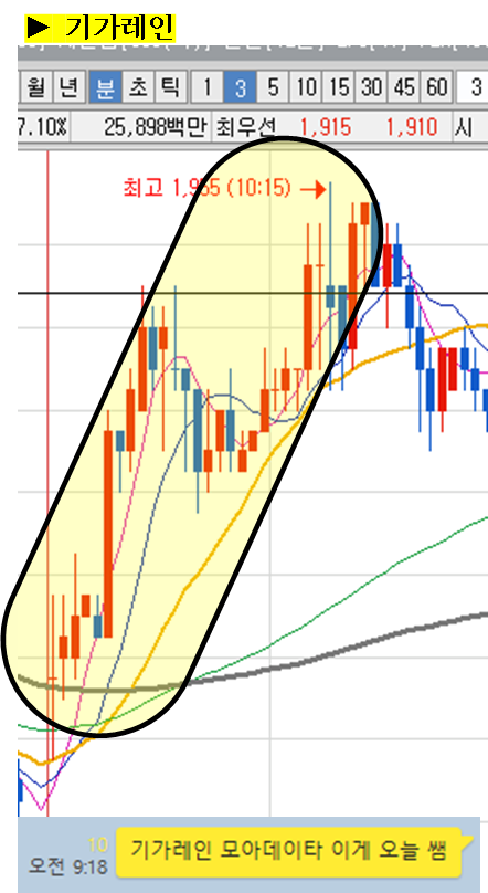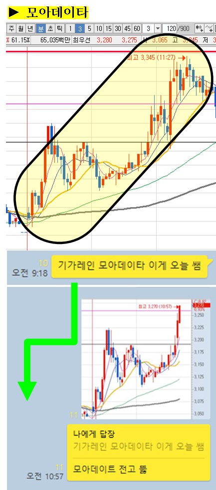 주식종목을 공유한 이후 주식의 움직임에 대해 그 현장을 생생하게 박제하여 생동감 있게 보여드리겠습니다. (차트에서 노란색 음영으로 표시된 부분을 자세히 봐주세요)