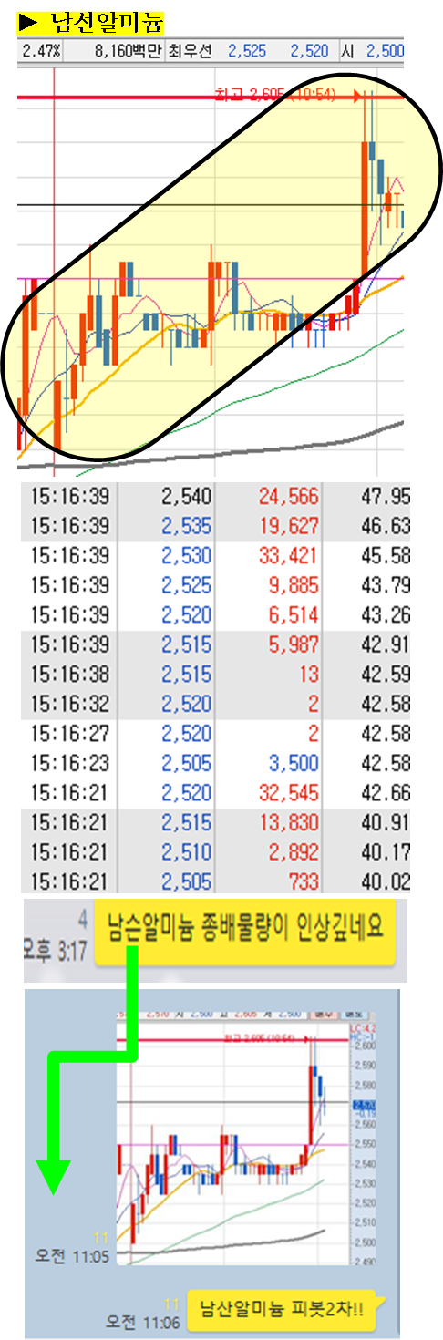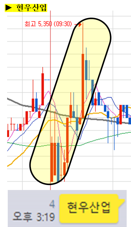 주식종목을 공유한 이후 주식의 움직임에 대해 그 현장을 생생하게 박제하여 생동감 있게 보여드리겠습니다. (차트에서 노란색 음영으로 표시된 부분을 자세히 봐주세요)