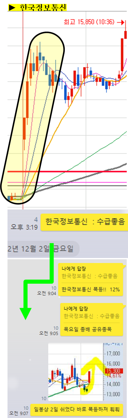 지난주 목요일 오후에 공유한 종목으로 2일 음봉으로 쉬어가다가 오늘 아침 20%가까운 폭등이 나온 대박 종목입니다. 이렇게 폭등하기 며칠전부터 미리 관점을 공유하는 경우 수익내기가 수월합니다.