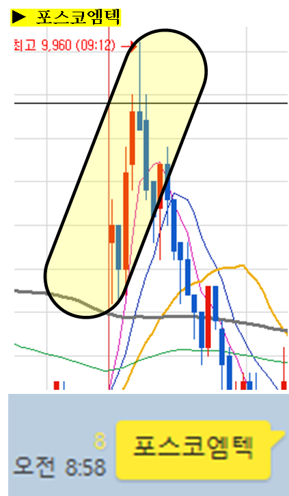 주식종목을 공유한 이후 주식의 움직임에 대해 그 현장을 생생하게 박제하여 생동감 있게 보여드리겠습니다. (차트에서 노란색 음영으로 표시된 부분을 자세히 봐주세요)