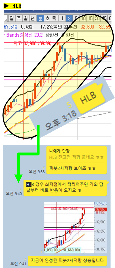 HLB (구 : 에이치엘비)는 어제 오후장에 공유한 이후 오늘 오전중에 피봇2차저항 이상 상승하며, 4%이상의 상승이 바로 나왔습니다. HLB는 과거에도 그렇고, 지금도 장기적인 관점에서 상승을 예측하기만 하면 다음날 부터 바로 반응이 나오는 규칙적인 종목입니다. 역대 에이치엘비를 공유하고 승리한 실적만 봐도 어마어마합니다. 일봉차트상 더이상의 하락은 멈추고 오늘을 기점으로 다시 상승하리라 보고있습니다.
