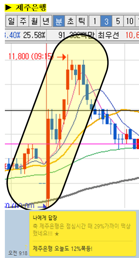 주식종목을 공유한 이후 주식의 움직임에 대해 그 현장을 생생하게 박제하여 생동감 있게 보여드리겠습니다. (차트에서 노란색 음영으로 표시된 부분을 자세히 봐주세요)