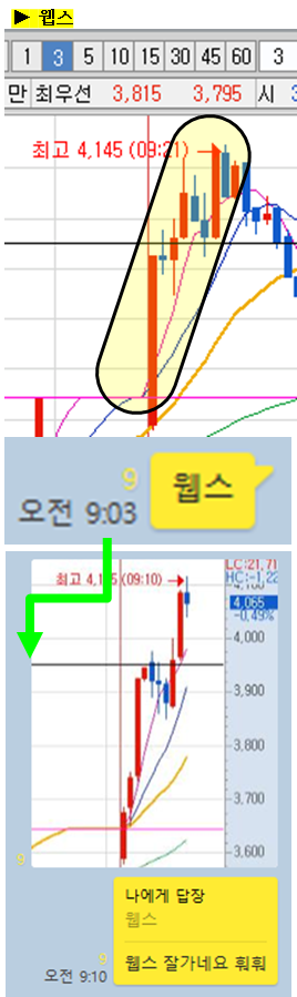 주식종목을 공유한 이후 주식의 움직임에 대해 그 현장을 생생하게 박제하여 생동감 있게 보여드리겠습니다. (차트에서 노란색 음영으로 표시된 부분을 자세히 봐주세요)