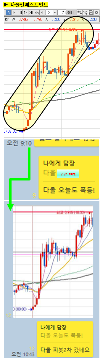 연속적으로 매일 언급되고 있는 종목으로 어제도 장중 21% 급등에 오늘도 최대 14%까지 급등이 나왔던 종목입니다. 달리는 말에 올라타라는 말이 다올인베스트를 두고 하는 말 처럼 들릴 정도입니다. 오늘로서 3900원의 벽을 깼기 때문에 앞으로도 상승흐름이 나온다고 지켜봐야할 종목입니다.