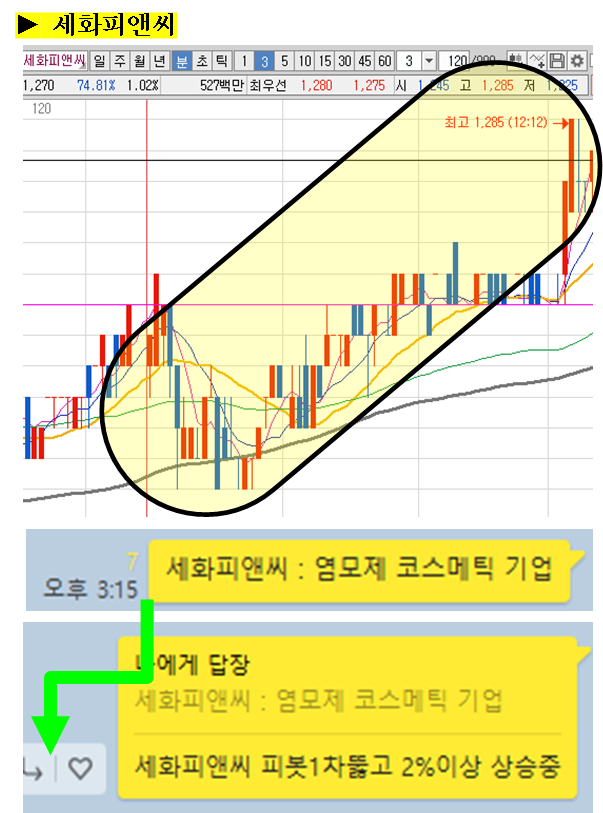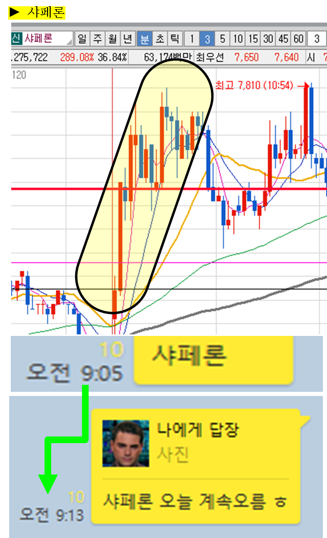 주식종목을 공유한 이후 주식의 움직임에 대해 그 현장을 생생하게 박제하여 생동감 있게 보여드리겠습니다. (차트에서 노란색 음영으로 표시된 부분을 자세히 봐주세요)