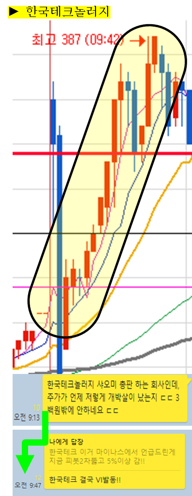 한국테크놀러지는 6%상승출발이후 마이너스때 공유를 한 종목이지만, 다시 급등하며 42분만에 피봇2차저항을 뚫고 9%가까운 급등이 나온종목입니다. 국내 샤오미 총판 관련 회사로, 과거 주식 가격에 비해 터무니없이 싼가격인 300원대에 거래되고 있는게 특이점입니다.