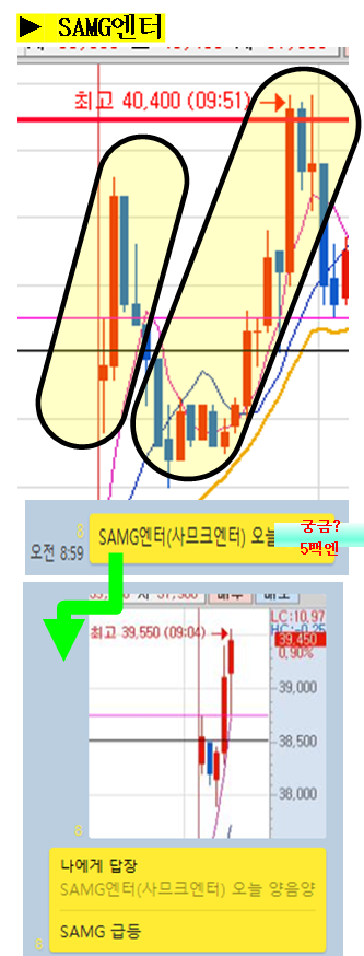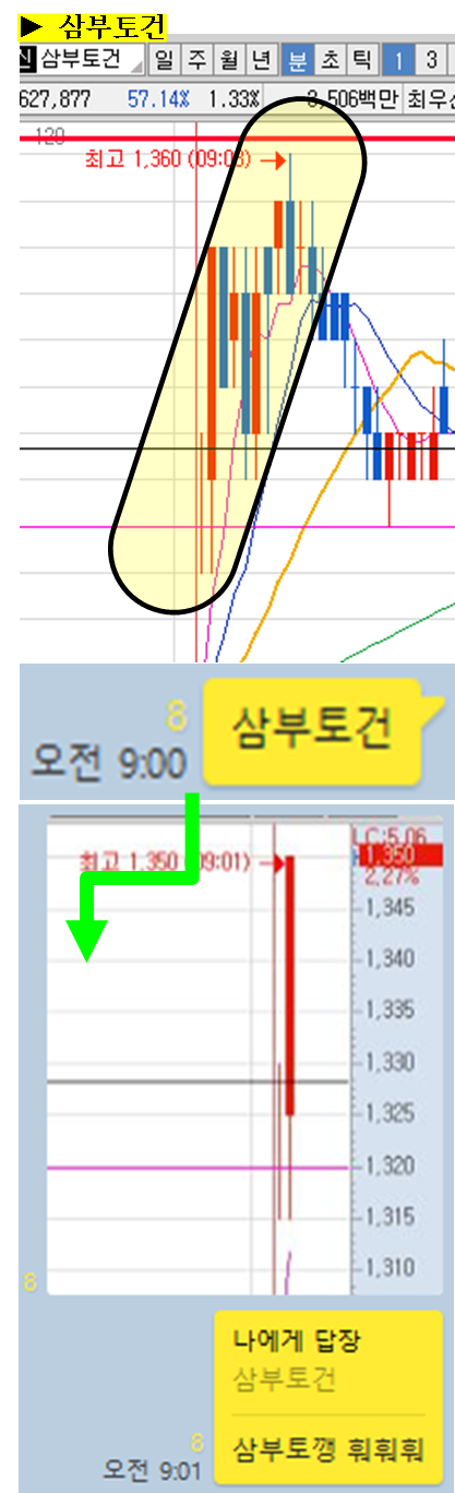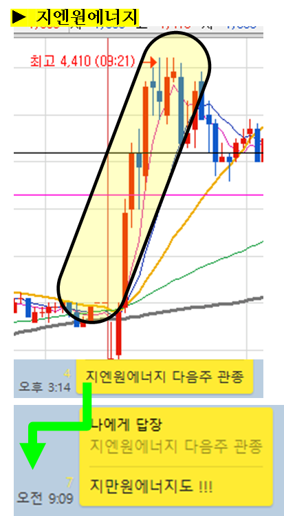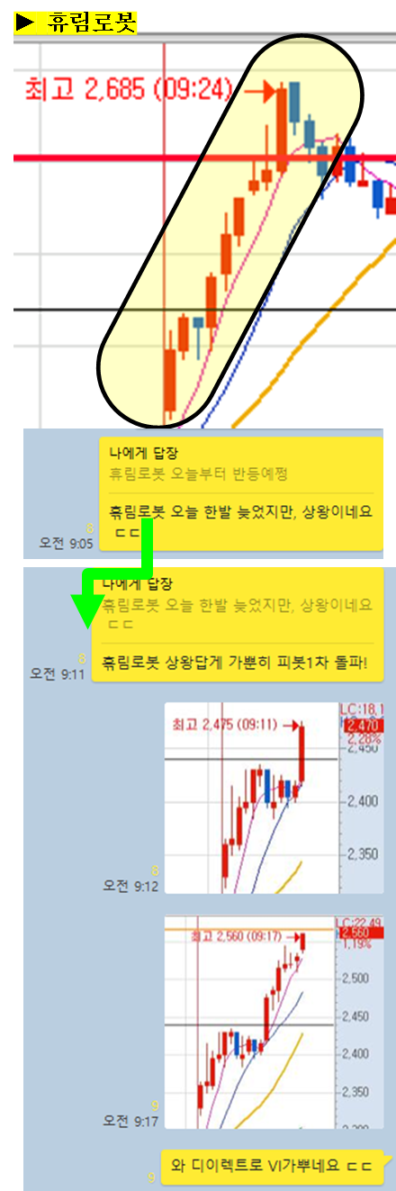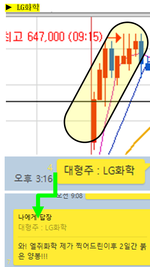 주식종목을 공유한 이후 주식의 움직임에 대해 그 현장을 생생하게 박제하여 생동감 있게 보여드리겠습니다. (차트에서 노란색 음영으로 표시된 부분을 자세히 봐주세요)