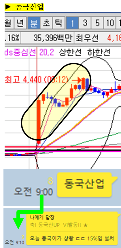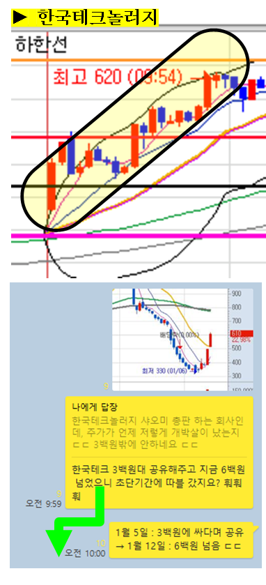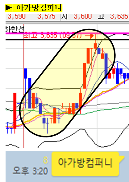 주식종목을 공유한 이후 주식의 움직임에 대해 그 현장을 생생하게 박제하여 생동감 있게 보여드리겠습니다. (차트에서 노란색 음영으로 표시된 부분을 자세히 봐주세요)