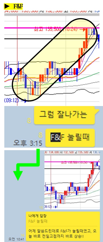 애기방컴퍼니도 적당한 가격에서 2% 상승이 바로 나왔고, 이 경우도 정확히 전일고점저항대까지 상승이 나온 것입니다.