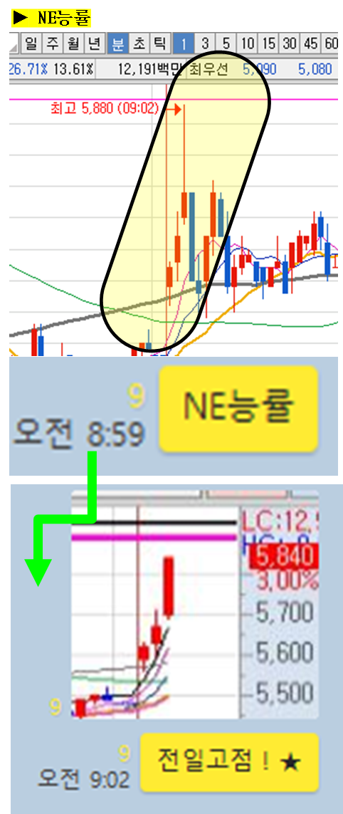 NE능률은 장전 예상 종목으로 공유하였으며, 2%상승 출발을 시작으로 단 2분만에 전일고점까지 상승하며 7%이상 올라갔지만,
