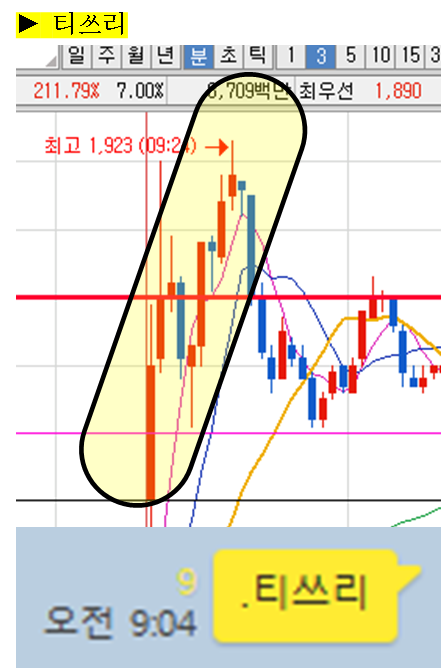 주식종목을 공유한 이후 주식의 움직임에 대해 그 현장을 생생하게 박제하여 생동감 있게 보여드리겠습니다. (차트에서 노란색 음영으로 표시된 부분을 자세히 봐주세요)