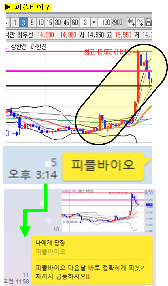 전날 공유종목으로 다음날 급등 확률이 매운 일봉차트 구간이였습니다. 역시나! 오늘 오전중에 피봇2차저항이상 상승하면서 6.5% 급등하였는데, 이때 최고점이 정확히 피봇2차였음을 차트를 통해 보시면 알 수 있습니다.
