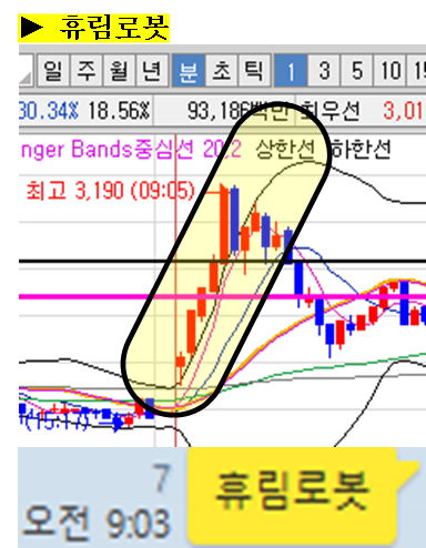 주식종목을 공유한 이후 주식의 움직임에 대해 그 현장을 생생하게 박제하여 생동감 있게 보여드리겠습니다. (차트에서 노란색 음영으로 표시된 부분을 자세히 봐주세요)