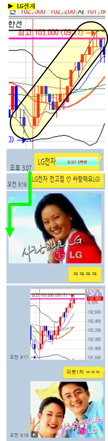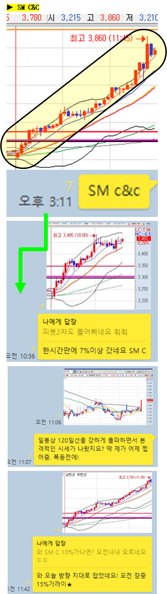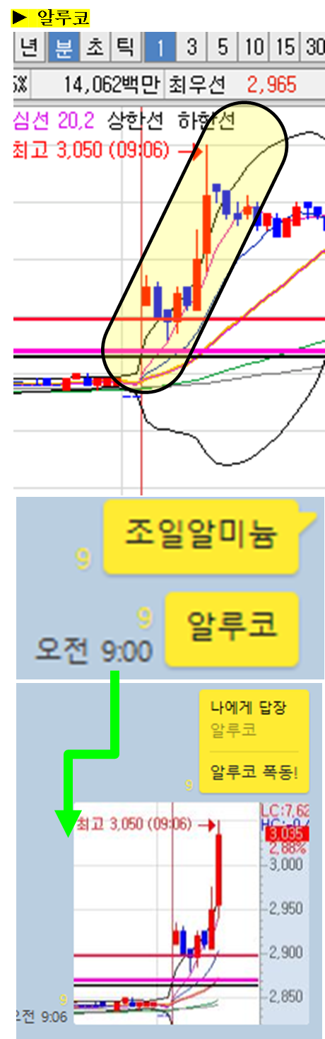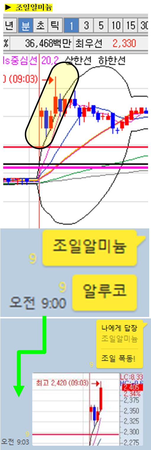 주식종목을 공유한 이후 주식의 움직임에 대해 그 현장을 생생하게 박제하여 생동감 있게 보여드리겠습니다. (차트에서 노란색 음영으로 표시된 부분을 자세히 봐주세요)