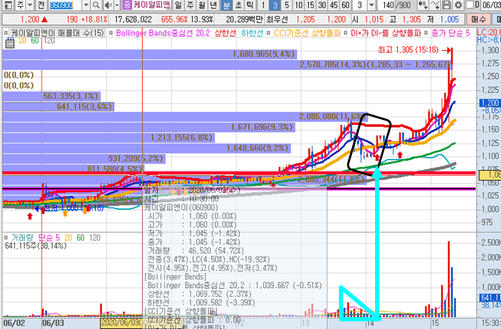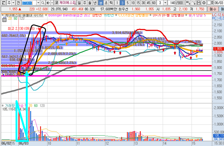 케이에스피 3분봉 입니다. SNK를 동시에 그시간에 매매하면서, 어제 상한가에 진입한 차바이오텍이 급락하면서 볼린져밴드 바깥에서라면 매수하려고 했지만, 60선 지지하고 올리고 이런 것을 검토하면서 1프로 띄기 매매를 상공한 그 순간에 이 좋은 종목 케이에스피를 놓쳐버렸습니다. 만약 오늘 공략 종목이3개였는데 그안에서만 집중했다면 충분히 매수 타점에서 바로 매수하고 급등 상황을 여유롭게 지켜볼 수 도있었지만 제가 발견한 것은 이미 VI가 발동된 상황이였으며, 물론 그 이후에도 한참더 상승하기는 했지만, 섣불리 매수 버튼 누르기는 다소 겁이 났었습니다. 급락종목에 차바이오텍을 보는사이에 귀중한 종목 놓친점 반성합니다.