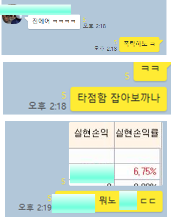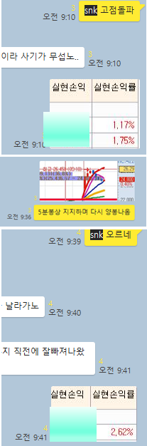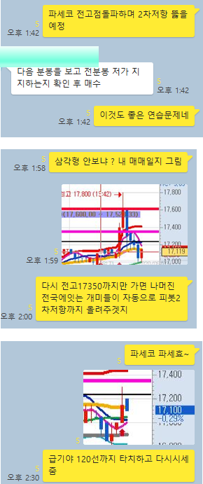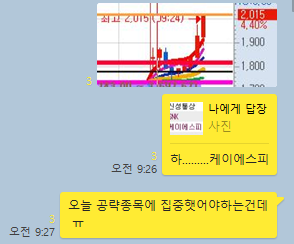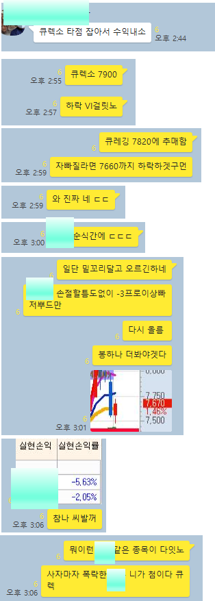 어제 오후에 발굴하여 상한가 보낸 차바이오텍이 장 종료후 악재 뉴스가 뜨는 바람에 오늘 급락이 나올 것이라 확신하며 볼린저밴드 하단 바깥에서 매매계획을 세운 것 때문에 금일 종목에 대해 다소 집중력이 흐트르져서 아쉬운 오전매매였습니다. 그 이후 오후에는 다양한 시도를 해봤는데, 크게 먹는 경우와 크게 손실입는 경우가 있습니다. 그럼 이해하기 쉽게 카카오톡 당시 대화 내용과 차트를 보면서 설명드리도록 하겠습니다.