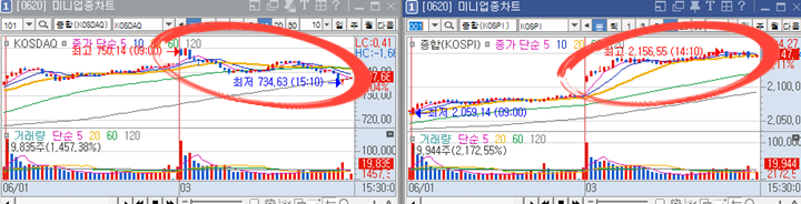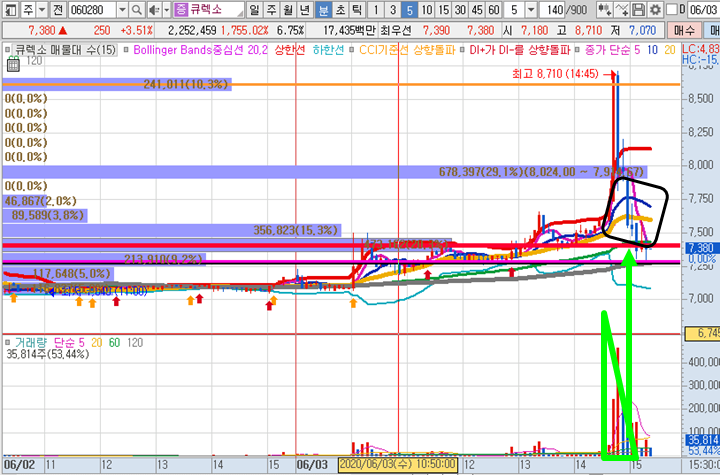 오늘 큰 거래량이 터진 종목입니다. 아마 오후 2시이후에 들어왔다 나간 물량으로 인한 거래량인데 이렇게 급락을 해도 5일선위에 위치해있네요. 오늘은 털렸지만 내일은 다시 상승해줄 것같은 예감이 드는 종목입니다. 보통 개미들이 많이 손절하면 그 주가는 다음날 더 큰 급등이 나오면서 개미들을 당혹스럽게 하는 경우가 많으니까요..