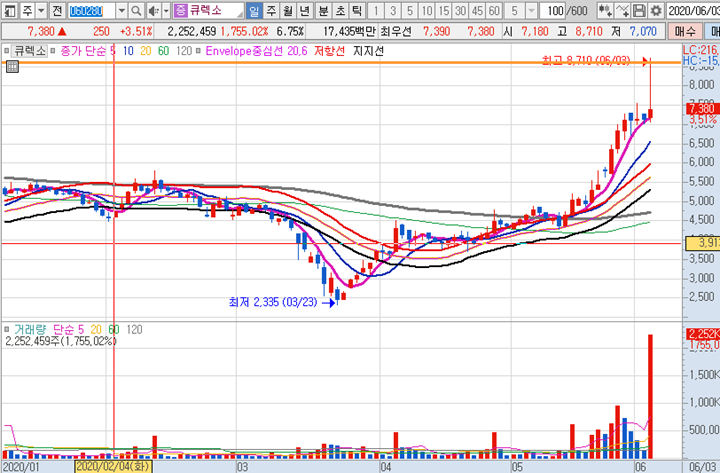 드림시큐리티 일봉차트 입니다. 최근 급등이 나온 종목으로 지난주 조정이 나오면서 어제 5일선을 지지하며 마무리가 되었으며, 오늘 거래량이 다시 크게 붙으면서 오후장에 급등이 나왔습니다. 전자서명, 양자컴퓨터 관련 종목으로 3월 19일 최저점 1070원이후에 주가가 4배이상 상승된 상태입니다. 거래소에서는 드림시큐리티에 대해 현저한 시황변동에 대한 조회공시를 요구한 상태 입니다. 회사측에서 무엇이라 답변을 내놓을지 궁금하네요.