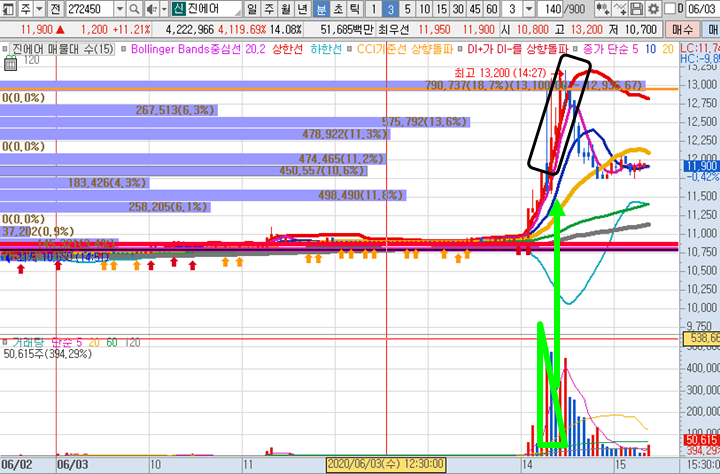 진에어 3분봉 입니다. 특이하게도 급등이후에 곧바로 오른만큼 바로 하락이 나오면서 주가가 굉장히 불안한 상태로 움직이고 있었습니다. 그래서 나름 지지하는 라인이라고 잡아본 구간에서 1분만에 무려 7%가까운 수익이 발생하여 눌라서 바로 매도해봤습니다. 매도하고도 주가가 오르락 내리락 반복을 하면서 최고점 13200원까지 급등이 나온 종목인데 결국 장 막판에는 지지선이 무너진 상태에서 마감이 되었습니다.