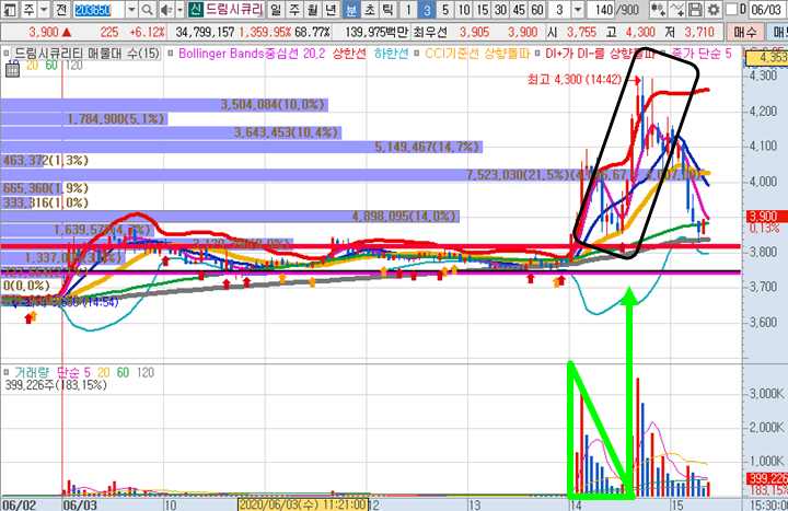 드림시큐리티 3분봉 입니다. 2시경에 언급한 종목으로 그 당시 큰 거래량이 나오면서 급등중에 있었습니다. 다시 조정구간이 오리라 생각하면서 지지하는 지점을 찾았는데, 3840원 기준 가격을 제시하였으나 그 바로 위에 가격까지만 하락하고 급하게 15분동안 급등이 나와서 너무 아쉬웠던 종목이였습니다. 아쉬운대로 시장가로 바로 매수했다면 15분동안의 급등쑈를 편안하게 즐길 수 있었을텐데… 다음부터 확실한 지지라인을 지키는데 성공한 종목이라면 시장가라도 바로 매수하여 실제 수익을 실현해 보겠습니다.