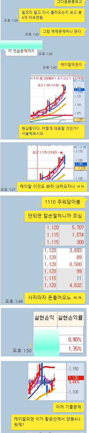 케이알 피앤이, 매매 타점 잡기가 어렵다는 요청이 많았기에 예시문제로 제시한 종목입니다. 1시 40분시40 당시 예제문제하나 준다면서 하는 말이 현재 급등상황에서 어떻게 대응할 것인가? 서술 해보시오라는 말을 하였습니다. 그래서 지지하는 구간을 찾아 1110원에 매수가격을 제시하였으며 곧바로 1%이상의 수익을 실현할 수 있었으며, 그이후로 조금 주춤했지만 그 자리에서 크게 벗어나지 않자 다시 가격을 회복하면서 상한가 바로 아래 호가까지 큰 급등이 나온 종목입니다. 오후장에는 다른 종목안하고 이종목만 보유했어도 큰 수익을 실현할 수 있었을텐데 나름대로 다양한 종목을 시도하였기에 짧은 수익으로 만족하고 나오게 되었습니다.