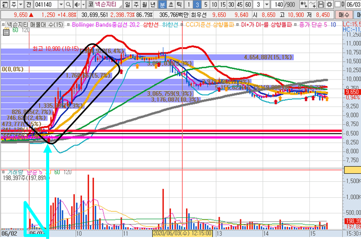 넥슨지티 3분봉 입니다3분 봉입니다. 9시29분에 처음 언급한 종목입니다. 저는 그 당시 주식 매매를 접으려고 하던 참이여서 보수적으로 보고 매매를 하지 않았는데 한 시간 뒤에 보니 주가가 거의 상한가 근처까지 상승해있었습니다. 첫 언급때 매수 이후 보이는 타점은 10시 부근 급등후 조정을 하며 이동평균선 지지할 때라고 보이며, 그 이후 걷잡을 수 없을 정도로 큰 급등이 나왔습니다.