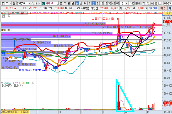 파세코 3분봉 입니다. 1시 42분에 큰 거래량과 함께 17800원까지 오르면서 급등하는 상황을 보았습니다. 바로 들어가지 않고 침착하게 지지하는 라인을 찾아서 17000부근대에서 1%대 단타를 2번 성공했습니다. 특이사항으로 3분봉상 120선 방어를 성공하고 난 이후에 장이 끝날 때 까지 지속적으로 상승이나오면서 완전한 반등을 보여줬습니다.