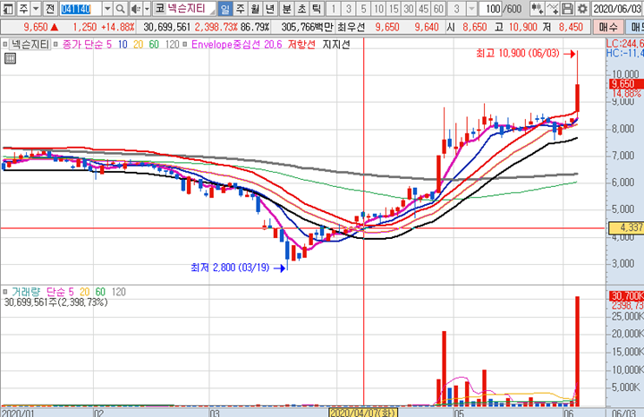 넥슨지티 일봉차트 입니다. 역대급 신고가가 나왔습니다. 제 영역에서 많이 벗어났기에 바로 성급하게 매매를 하지는 않을 것 같습니다.