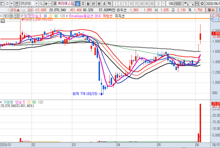 케이에스피 일봉차트 입니다. 어제도 거래량이 나름대로 많이 나왔는데 오늘은 최근 거래량중에 역대급으로 많이 나온 하루였습니다. 카타르 LNG선 대형 수주에 조선, 철강 등 관련주가 급등이 나오고 있는데 케이에스피의 경우에는 선박용 엔진밸브를 주로 생산하는 제조업체입니다. 그래서 조선주의 상승에 힘입어 같이 상승을 하고 있는데 오늘 너무나 완벽한 타점까지 다 나왔지만 매매를 하지 못해 아쉬운 종목입니다.