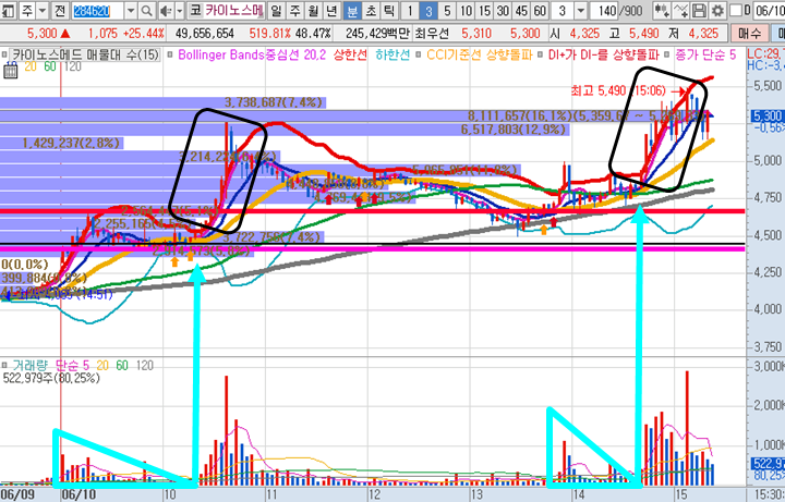 카이노스메드 3분봉 입니다. 특이하게도 어제 장전 예상종목을 선정한 것과 똑같은 종목을 선별하였습니다. 오늘 아침부터 전일고점 아래에서 거래량이 점차 늘어나면서 전일고점 돌파를 시도하였으며, 결국 전일고점 돌파를 시도한 이후에 잠시 조정을 거치고 황금선 까지 조정이 오고 10시경부터 급격한 상승시세가 나오기 시작했습니다. 그리고 오후2시경까지 주가가 힘을 못쓰고 계속 하락이 나왔지만 120일선을 지지하면서 다시 반등이 나오기 시작했으며 장 막판에 다시 급등이 나오면서 장중 상한가에 진입하기도 했습니다. 저는 대체적으로 두번째 네모박스 구간에서 상한가가는 길목에서 2번 매매를 하여 수익을 많이 실현할 수 가 있었습니다.