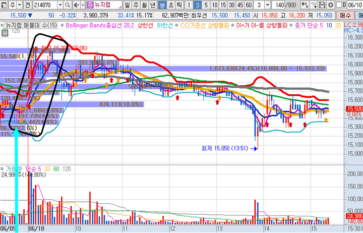 뉴지랩 3분봉 입니다. 어제 장중에 15%이상의 급등시세가 나오면서 매수타점에서 여러 번 수익구간이 나온 종목인데, 5분봉으로 봤을 때 정확하게 지지하는 구간을 발견하고 종가배팅을 15500원 부근에 제시한 종목 입니다. 시초가부터 3프로 가까운 갭상승이 나왔으며, 최대 5%정도의 수익구간까지 상승 하였습니다. 저는 최고 유리한 가격인 15350원에 종가배팅을 하였기에 시초가에 매도하여도 비교적 여유있는 수익 실현이 가능하였습니다. 전체적인 분봉차트를 보면 아침에 매도로 대응한것이 잘한 것이라고 생각이 됩니다. 왜냐면 10시이후부터는 갈 수록 주식이 하락하기만 했기 때문입니다.