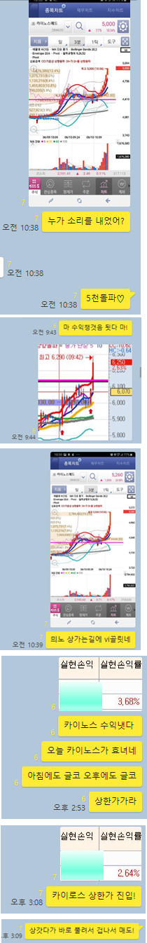 어제는 오랜만에 공식적으로 종가배팅 종목을 매수 추천하였습니다. 그 종목은 뉴지랩으로 어제 장중에도 많이 보인 종목인데, 종가에 지지하는 것을 확인하고 매수가를 제시하였었고 장 시작과 동시에 3%정도 수익을 챙기면서 기분좋게 출발할 수 가 있었습니다. 오늘의 장전 예상종목을 찾는데, 어제와 같은 종목을 선정했습니다. 그 종목은 빅텍과 카이노스메드로 어제도 수익구간을 준 종목인데, 오늘도 다시 상승하기 위해 장 시작전부터 제가 미리 선정을 해서 공유하였습니다. 그럼 이해하기 쉽게 카카오톡 당시 대화내용과 차트를 보면서 설명 드리도록 하겠습니다.