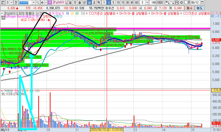 경남바이오파마 3분봉 입니다. 3거래일 연속적으로 장중에 큰 돈이 들어오는 것을 목격하였는데, 오늘 아침에도 그러한 현상이 느껴져서 9시 17분에 이야기를 하였습니다. 그 이후 잠시 지지하는 눌림목 구간까지 약하게 하락하다가 10시까지 계속적으로 상승이나왔습니다. 눌림목 구간인 6200원이 매수타점으로 그 부근에 매수하였다면 최고점인 7120원에 매도할 경우 15%가까운 상승률을 보여준 매우 강력한 종목이였습니다. 보통 매수타점에서는 가장 이상적인 것이 더 이상 하락이 나오지 않고 10시까지 지속적으로 상승이 나와야 되는데 이 종목이 그러한 조건을 만족하였습니다.