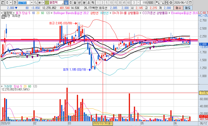 엘컴텍 일봉차트 입니다. 주식시장이 불안해지면 반대로 주가가 오르는 대표적인 종목으로 전일 미국장 급락여파로 오늘 시초가에 급하게 오르다가 국내 지수가 급락이후에 일제히 반등하면서 하락하면서 윗 꼬리가 달린 음봉으로 마감되었습니다. 어떻게 보면 지금이 매수타점일 수 도 있습니다. 단기적으로 2000원대에 매수하고 2250원부근에 매도하여 10%의 수익을 챙기는 시나리오를 생각해봤습니다. 앞으로 시장분위기가 어수선해질 것이기 때문입니다.