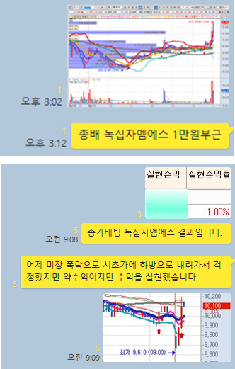 예상치 못한 미국장의 급락으로 인해 오늘 국내증시에도 장초반에 급락으로 출발하는 영향을 미치게 되었습니다. 그러나 이러한 급락장 분위기 속에서도 국내장은 급락으로 출발이후에 장중에 계속적인 매수세가 들어오면서 금요일 장이지만 꾸준히 상승을 한 모습 이였습니다. 종가배팅 종목도 시초가에 -3프로 가량이나 빠지면서 시작했으나 그 이후 지속적으로 상승이 나오면서 역시 수익을 실현할 수 있었으며, 공포의 하락장이였지만 어떻게 선정한 종목 대부분을 수익을 실현했는지에 대한 상세한 설명을 드리도록하겠습니다. 오늘 매매한 종목 역시 대부분 코로나19바이러스와 관련 된 제약주임을 미리 알려드립니다. 그럼 이해하기 쉽게 카카오톡 당시 대화내용과 차트를 보면서 설명 드리도록 하겠습니다.