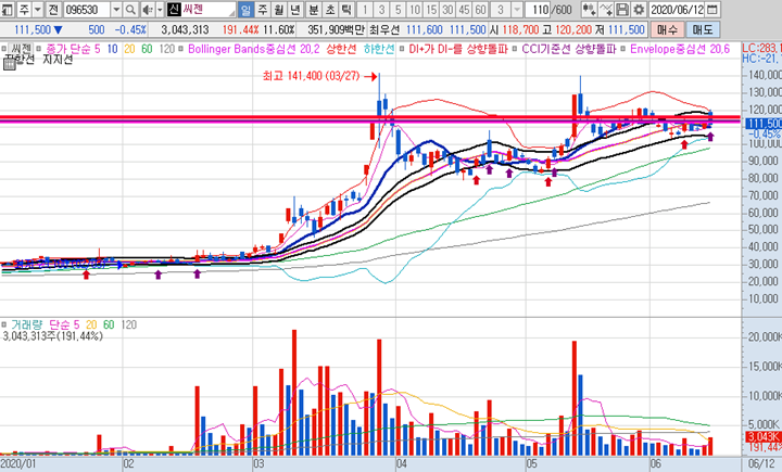 씨젠 일봉차트 입니다. 시초가의 강한 상승분위기를 지키지 못하고 장종료시에 최저가로 마감하면서 긴 음봉으로 마감하였습니다. 연이어 2일간 외국인, 기관의 수급도 들어왔지만, 오늘의 수급은 개인투자자만 물량을 다 받고, 외국인, 기관투자자 모두 매도로 돌어섰습니다. 씨젠은 코로나 19진단키트 생산업체이기 때문에 코로나 확산소식이 계속되는 한 해당 회사의 주가는 계속 오를 것 입니다. 그러나 투자시에 외국인과, 기관의 매도세가 자꾸 강하게 나온다면 다시 검토해볼 필요가 있으니 주의를 해야 합니다.