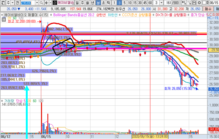 에이비엘바이오 3분봉 입니다. 시초가에 강한 거래량으로 갭상승으로 힘차게 출발한 종목입니다. 3분봉 매수타점에서 먼저 빠른 수익실현후 5분봉 매수타점에서도 한번더 수익을 실현한 종목입니다. 이 종목은 계속 보유시에 오후장 국내지수 폭락의 영향으로 인해 돈을 크게 잃었을 수도 있는데 역시 정확한 매매타점에서만 접근했기에 위험부담없이 안전하게 수익실현이 가능하였습니다.