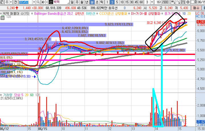 한일단조 3분봉 입니다. 6월 9일에 이미 공략한 종목으로 오늘 오후에 큰 거래량이 일어나면서 상승분위기에 다시 공략하고자 한 종목입니다. 급등상황이 잘 이어지고 있다가 음봉이 나오기 시작하였으며 황금선부근에서 매매타점을 제시하려고 했다가 급격히 하락하는 모습을 보고 잠시 머뭇거렸지만 곧바로 다시 급등이 나온 종목입니다. 2시44분에 이때 살까? 이 말을 던진이후에 나온 양봉의 개수를 보시기 바랍니다. 무려 30분이상 다시 상승이 나오면서 상한가근처까지 급등이 나왔습니다. 최고점이 2000원까지 갔었는데 매수타점인 1800원대에서는 무려 11프로 이상의 상승이 나온 구간이였습니다.