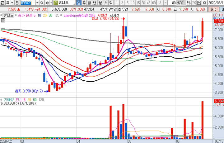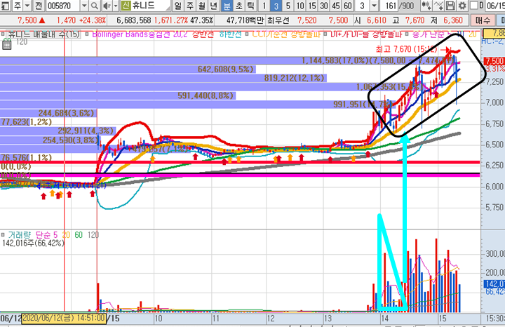 휴니드 3분봉 입니다. 오후장 들어서면서 다른 개별종목은 급락이 나오는데 특별히 상승하면서 거래량이 많이 몰리는 종목이 눈에 띄였습니다. 그 종목은 휴니드로 3분봉상 제가 언급한 이후에 지속적인 상승이 나오면서 장중에 상한가 근처까지 상승을 한 강력한 종목입니다. 최초 2시29분에 매수타점을 제시하면서 언급을 하였고 최고 7670원까지 상승을하면서 그 수익구간은 무려 10%이상의 상승률이 나왔습니다.