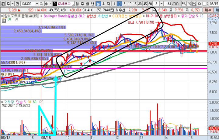 알서포트 3분봉 입니다. 이 종목은 오늘의 공략종목으로 시초가 강한 거래량으로 갭상승으로 출발하여, 9시30분경 매수타점인 6600원대에서 매수체결이 되고 최고점인 7790원까지 보유했다면 무려 18%의 상승률이 나온 강한 종목입니다. 차트를 보시면 계산식으로 지속적인 상승이 나오며 주가가 오르다가 일시적인 하락이 있어도 황금선을 항상 지키면서 올라간 것이 매력적으로 보입니다.
