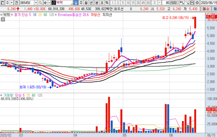빅텍 일봉차트 입니다. 빅텍이 주식상장된 이래 역대급 신고가가 오늘 달성이 되었습니다. 최근 북한이 남한에게 경고성 발언과 강경대응에 대한 위기를 느끼며 방위산업 관련업체만 집중적으로 수급이 들어오며 급등이 되고 있습니다. 이러한 종목에만 돈이 몰리는 현상 때문에 개별 종목들 대부분이 무참히 무너지고 있는데, 빅텍같은 방산주가 오른 다는 것은 좋은 분위기는 아니지요. 그저 돈이 몰리는 종목에 단타로만 대응하는 수 밖에 없습니다.