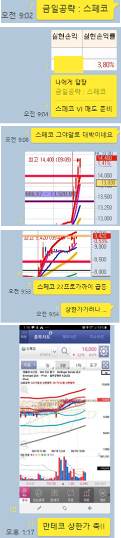 오늘의 경우 장전예상 종목 1개, 시초가 공략 종목 1개 이렇게 각각 1개씩만 공유하였습니다. 왜냐하면 그만큼 확신을 하였기 때문입니다. 역시 그 두종목은 크게 상승하며 스페코의 경우 장중 상한가를 기록하였으며, 이연제약의 경우 9%가까이 상승을 하였습니다. 특히 오늘은 상한가 가는 종목을 어떻게 매수타점을 잡았는지에 대한 내용을 상세히 설명을 하였습니다. 그럼 오늘 매매에 대해 이해하기 쉽게 카카오톡 당시 대화내용과 차트를 보면서 설명 드리도록 하겠습니다.