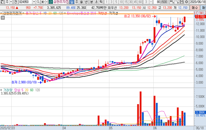 이연제약 일봉차트 입니다. 2일간 30%이상의 급등이 나온 주식시장 관심종목입니다. 이연제약은 노터스와 함께 코로나 치료제 신규 후보물질을 도출하고 있으며 빠른 시일내에 비임상을 마무리하고 임상시험을 추진할 예정이라는 소식이 있은 이후로 주가가 계속 상승세에 있습니다. 오늘은 덱사메타손이라는 약품이 코로나 19 치료제로 부각이 되면서 관련 약품을 취급하는 제약사들이 크게 상승하였는데 이연제약도 관련이 있는 것 같습니다.