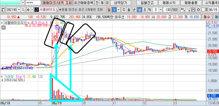 시초가에 엄청난 거래량과 함께 갭상승으로 출발한 강력한 종목입니다. 어제처럼 오늘도 시초가에 단 한종목만을 선별해서 집중매매를 하기로 했습니다. 보시는 차트는 오늘 시초가에 매수매도의 매매마크가 표시된 차트입니다. (키움증권 단축번호 0606을 이용하시면 됩니다.) 시초가에 키움증권으로 시초가 매매를 멋지게 성공하고, 네모박스 친 구간에서 다른 증권사로 계속 매매하여 오늘 한 종목으로 총 3번 수익을 실현하였습니다.