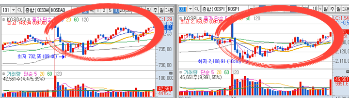 9시3분이 지나고 다음분봉이 나오는 4분부터 시초가 돌파여부 확인을 해야했기에 계속집중을 했는데 3번째봉이 음봉으로 약간 주춤하다가 그 다음 분봉부터 바로 급등이나왔습니다. 이 때 다시 거래량은 전분봉에 최저의 거래량에서 급등이 나오고 있는 상태였습니다.