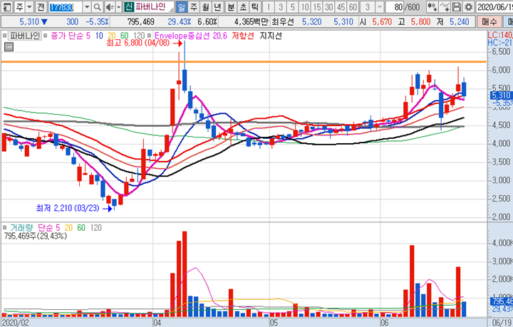 피버나인 일봉차트 입니다. 4월경에 6800원까지 상승을 했다가 조정기간을 거친후 다시 거래량이 붙고 있는 상태에서 주가의 상승과 하락 변동폭이 심한 종목입니다. 알루미늄 제품전문 업체로 알려져있으며 주로 컴퓨터, 휴대폰 등 케이스 제작 및 부품개발, 아노다이징을 하는 업체 입니다. 다시 하락추세로 온다면 4700원부근까지 하락을 할 수 도 있습니다. 그 다음의 박스권은 현가격인 5300원부근과 4700원 부근으로 보이는데 4700원에서 스윙 보유하고 현가격에 다시 매도하는 계획을 세워봤습니다.