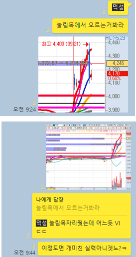 오늘의 경우 장전예상 종목 1개, 시초가 공략 종목 1개 이렇게 각각 1개씩만 공유하였습니다. 왜냐하면 그만큼 확신을 하였기 때문입니다. 역시 그 두종목은 크게 상승하며 매수타점에서 수익구간을 충분히 주었으며, 그 외에 또 다른 선별 해놓은 종목들이 특별한 고민없이 모두 수익을 실현할 수 있었던 하루였습니다. 특히 오늘은 상한가 가는 종목을 어떻게 매수타점을 잡았는지에 대한 내용을 상세히 설명을 하였습니다. 그럼 오늘 매매에 대해 이해하기 쉽게 카카오톡 당시 대화내용과 차트를 보면서 설명 드리도록 하겠습니다.