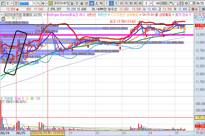 코리아써키트 3분봉 입니다. 어제 종가배팅으로 추천한 종목으로 그 당시 12350원 부근 가격으로 제시하였습니다. 그런데 미국장이 하락으로 마감하여 오늘 장 하락으로 출발할게 뻔해보였기 때문에 그냥 2프로 정도 수익을 일찌감시 챙기면서 나왔는데, 최대 13700원까지 오르면서 매수가에서는 무려 10%이상의 수익구간이 나왔습니다.