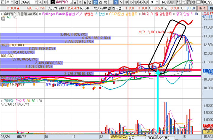 유비케어 3분봉 입니다. 처음 제시가격 11450원 대비하여 최고점인 13300원은 16%이상의 수익구간이 나왔습니다.